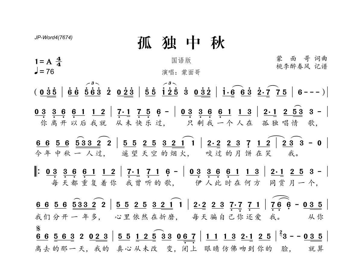 蒙面哥《孤独中秋》简谱 - 国语版