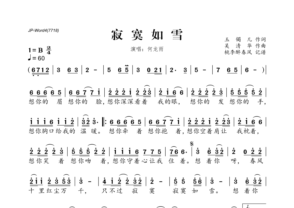《寂寞如雪》是何龙雨演唱的一首歌曲,拍号为2/4拍,歌曲速度为每分钟60拍,这份简谱共有一张高清图谱,图谱由 @桃李醉春风 编配上传。