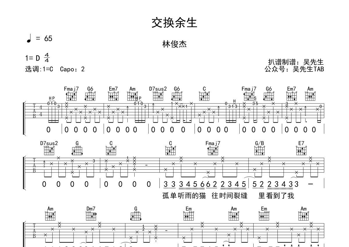 《交换余生》是林俊杰演唱的一首歌曲,本吉他谱采用的是C调指法编配,这份吉他谱共有两张高清图谱,图谱由 @吴先生TAB 编配上传,图谱使用六线谱编配,包含吉他和弦指法、简谱以及歌词部分,使用这份交换余生吉他谱,可以让你更加方便地掌握这首歌曲的弹唱技巧,快来尝试吧。林俊杰《交换余生》吉他谱_C调吉他弹唱谱。