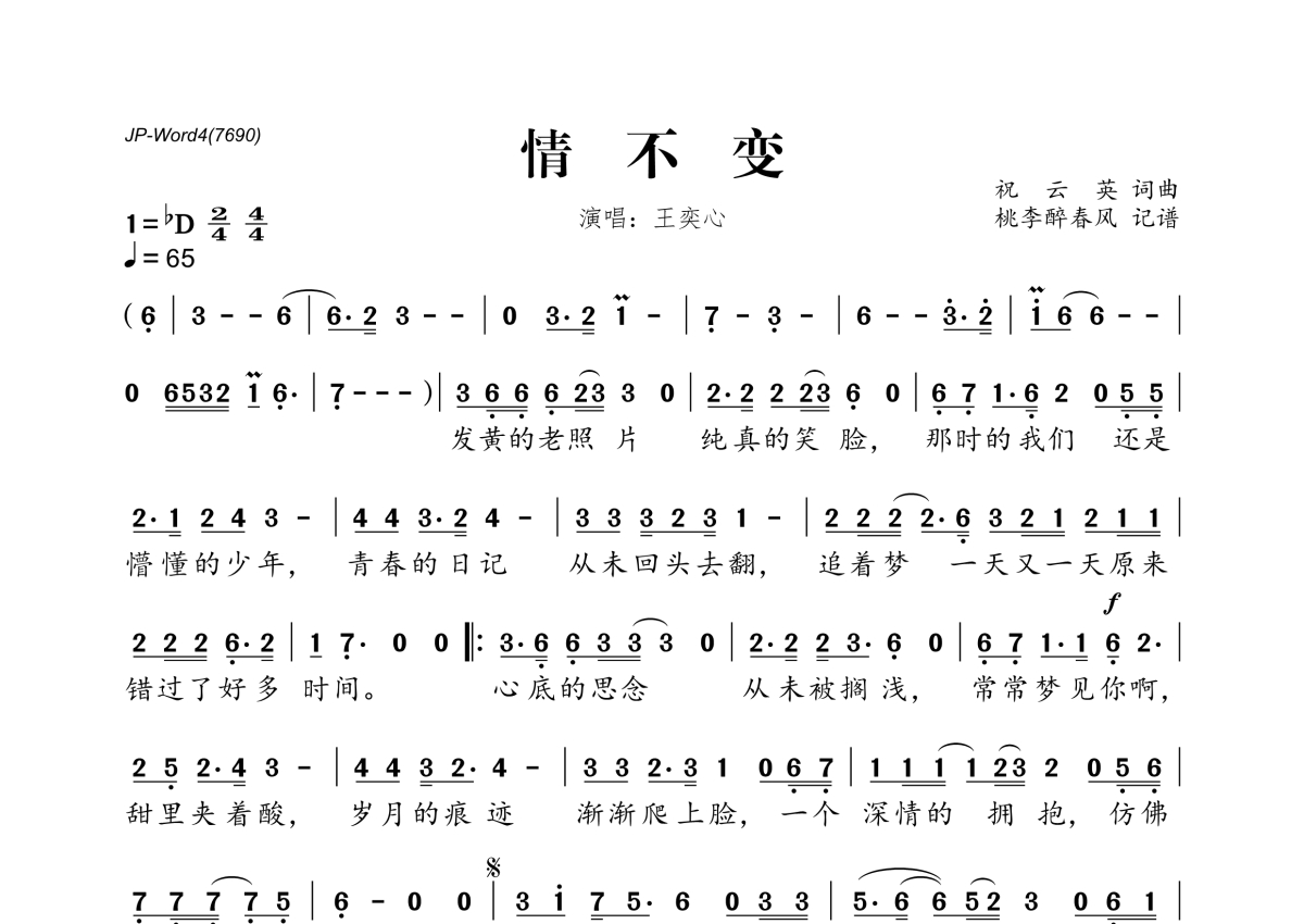 《情不变》是王奕心演唱的一首歌曲,拍号为2/4拍,歌曲速度为每分钟65拍,这份简谱共有一张高清图谱,图谱由 @桃李醉春风 编配上传。