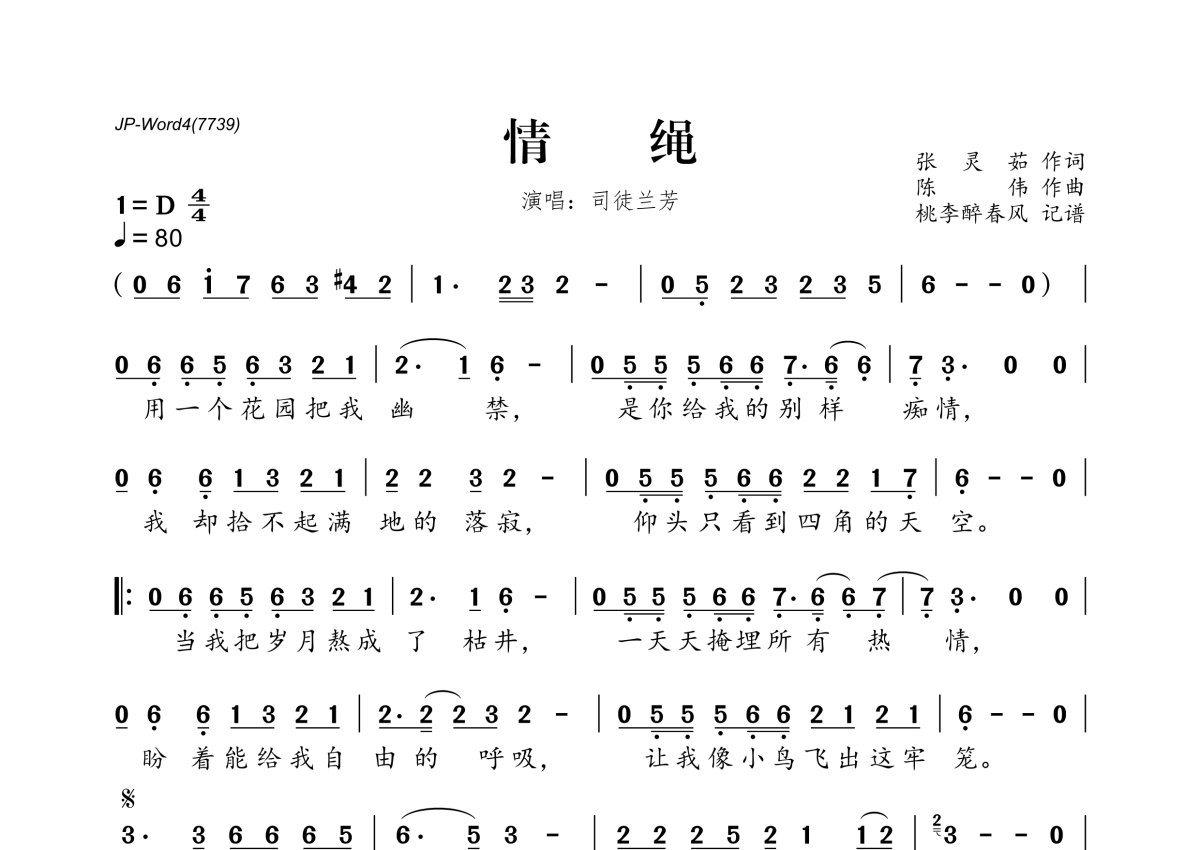 《情绳》是司徒兰芳演唱的一首歌曲,拍号为4/4拍,歌曲速度为每分钟80拍,这份简谱共有一张高清图谱,图谱由 @桃李醉春风 编配上传。