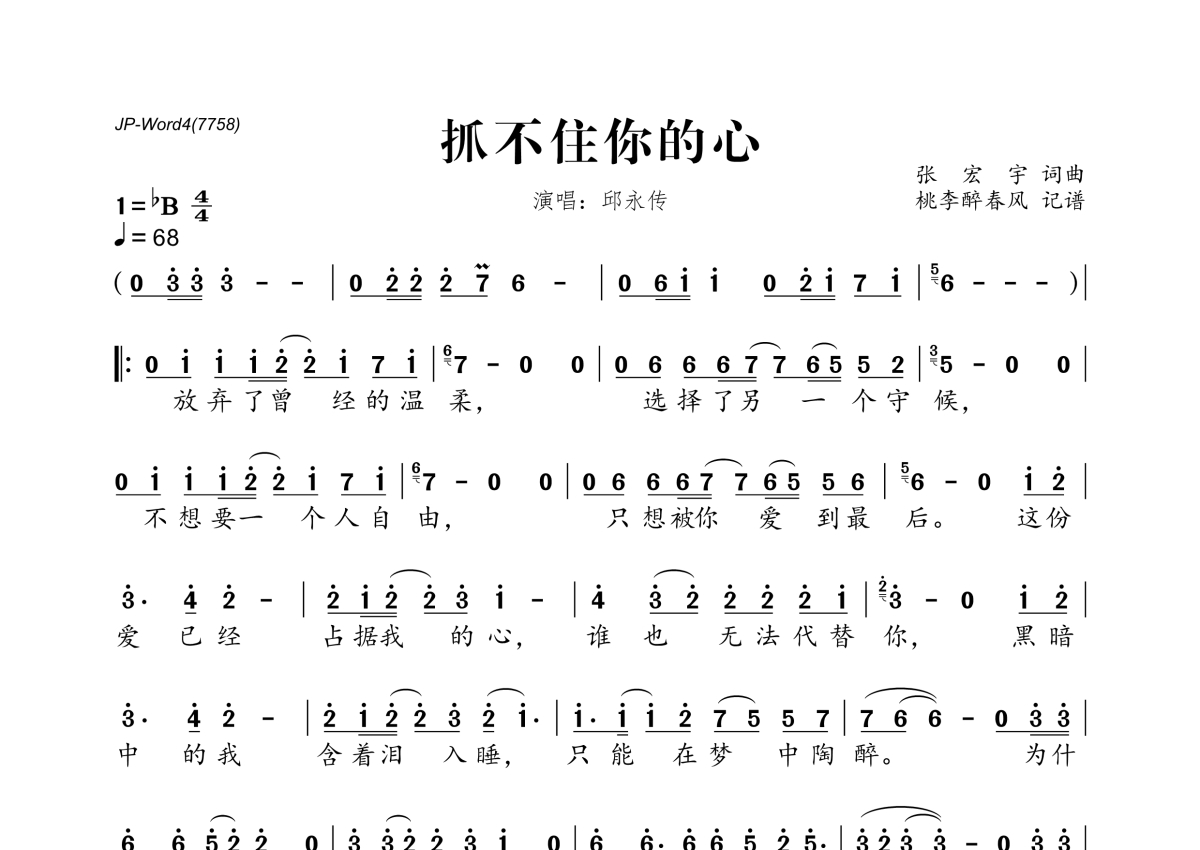 《抓不住你的心》是邱永传演唱的一首歌曲,拍号为4/4拍,歌曲速度为每分钟68拍,这份简谱共有一张高清图谱,图谱由 @桃李醉春风 编配上传。