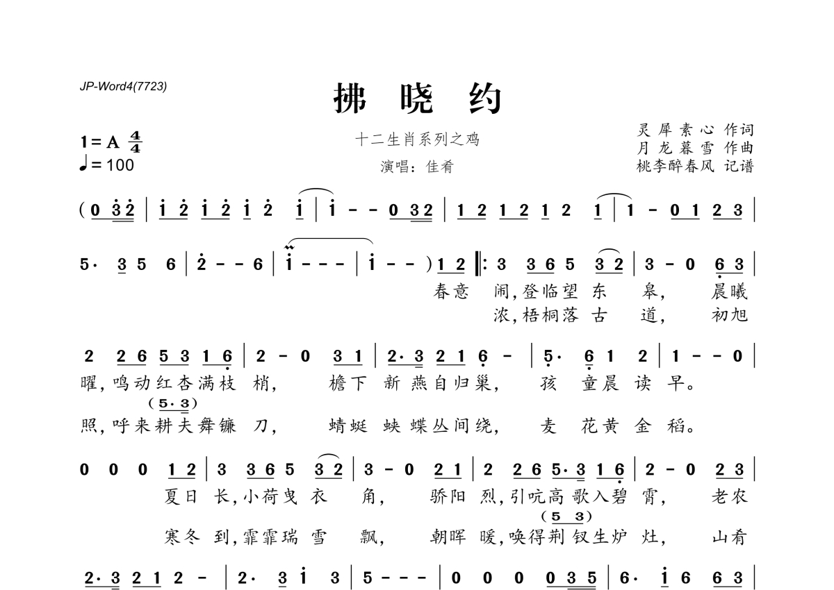 《拂晓约》是佳肴演唱的一首歌曲,拍号为4/4拍,歌曲速度为每分钟100拍,这份简谱共有一张高清图谱,图谱由 @桃李醉春风 编配上传。