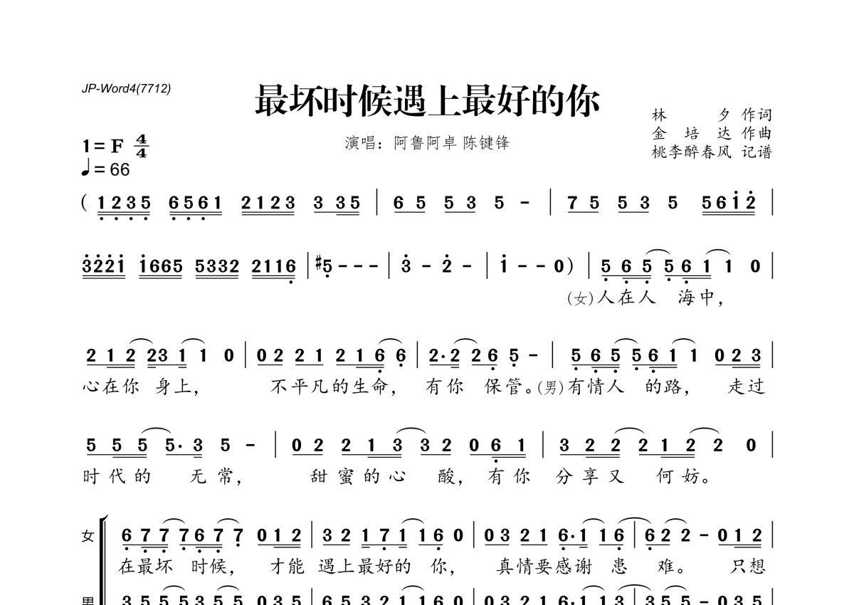 《最坏时候遇上最好的你》是阿鲁阿卓&陈键锋演唱的一首歌曲,拍号为4/4拍,歌曲速度为每分钟66拍,这份简谱共有两张高清图谱,图谱由 @桃李醉春风 编配上传。