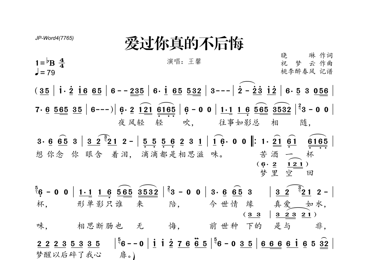 《爱过你真的不后悔》是王鑫演唱的一首歌曲,拍号为4/4拍,歌曲速度为每分钟79拍,这份简谱共有一张高清图谱,图谱由 @桃李醉春风 编配上传。