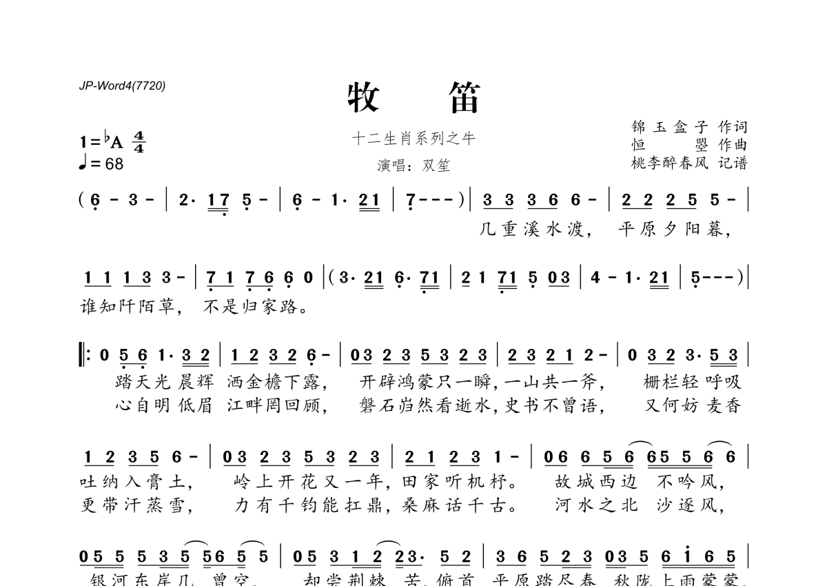 《牧笛》是双笙演唱的一首歌曲,拍号为4/4拍,歌曲速度为每分钟68拍,这份简谱共有一张高清图谱,图谱由 @桃李醉春风 编配上传。