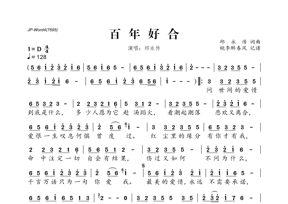 《百年好合》是邱永传演唱的一首歌曲,拍号为4/4拍,歌曲速度为每分钟128拍,这份简谱共有一张高清图谱,图谱由 @桃李醉春风 编配上传。