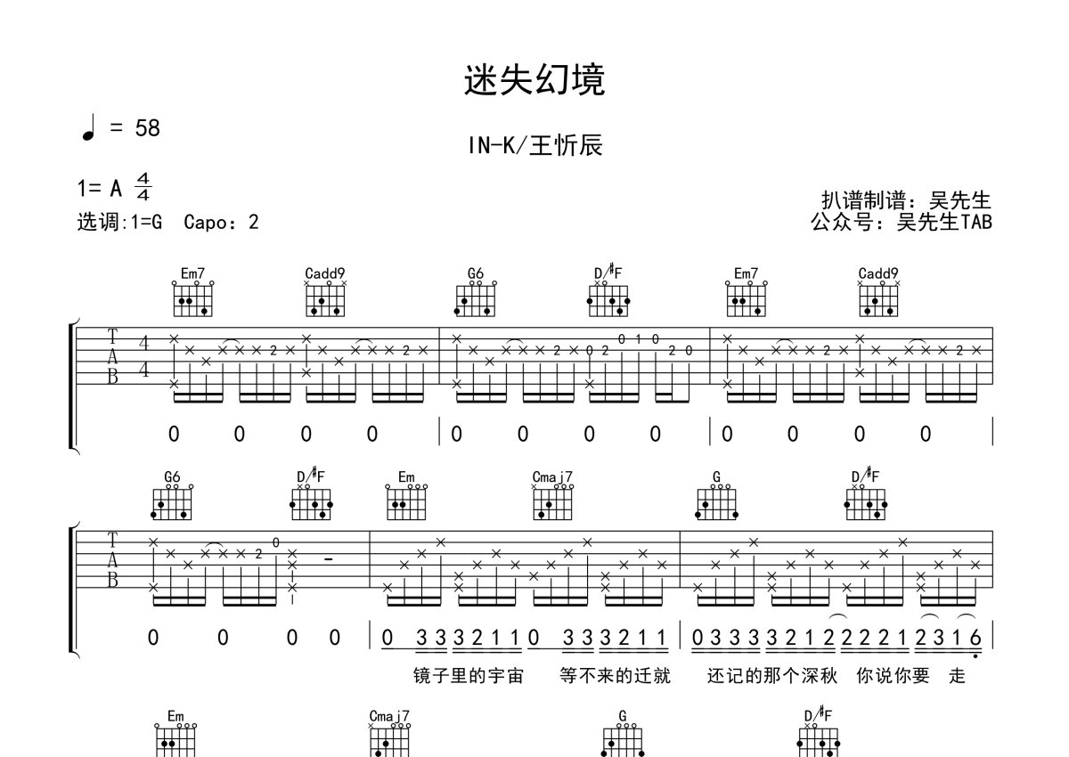 《迷失幻境》是IN-K/王忻辰演唱的一首歌曲,本吉他谱采用的是G调指法编配,这份吉他谱共有两张高清图谱,图谱由 @吴先生TAB 编配上传,图谱使用六线谱编配,包含吉他和弦指法、简谱以及歌词部分,使用这份迷失幻境吉他谱,可以让你更加方便地掌握这首歌曲的弹唱技巧,快来尝试吧。《迷失幻境》吉他谱,G调吉他弹唱谱,原调A调,弹唱变调夹夹第二品。 镜子里的宇宙,匆匆忙忙,仿佛遇见了,又恍然失去了。还留着你的回忆,每个场景里都有我们存在过的身影,走过的每张地图就仿佛我们还在一起。那些美好,那些甜蜜,会变成梦魇,一遍遍撕拉着心底最柔软的脆弱。不知从几时起就逐渐流失了温柔,慢慢慢慢成为心中的痛。来不及说出口的抱歉,来不及许你的未来,来不及感受来日方长。沉溺于我们的昨天,可我真的不想迷失在这幻境里找不到自己。再次相见不知道到何时,虽然你已渐渐远去,但在心中,却并没有远离。