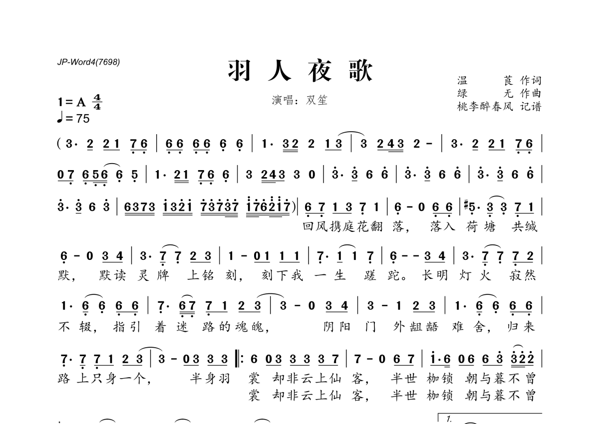 《羽人夜歌》是双笙 (陈元汐)演唱的一首歌曲,拍号为4/4拍,歌曲速度为每分钟75拍,这份简谱共有一张高清图谱,图谱由 @桃李醉春风 编配上传。