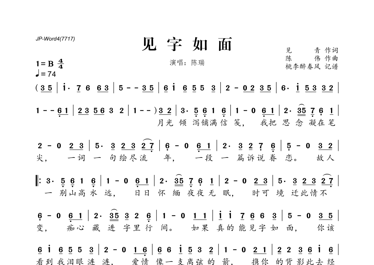 《见字如面》是陈瑞演唱的一首歌曲,拍号为4/4拍,歌曲速度为每分钟74拍,这份简谱共有一张高清图谱,图谱由 @桃李醉春风 编配上传。