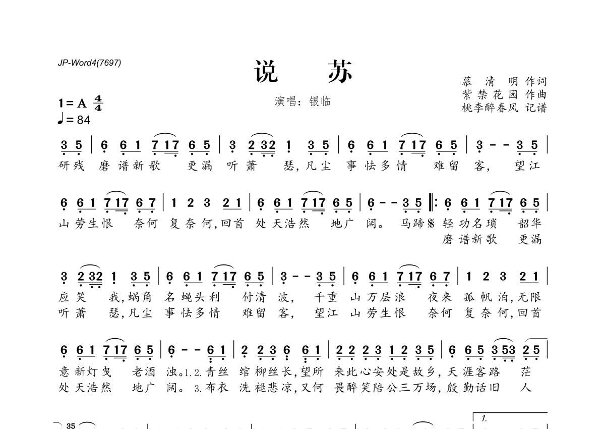 《说苏》是银临演唱的一首歌曲,拍号为4/4拍,歌曲速度为每分钟84拍,这份简谱共有一张高清图谱,图谱由 @桃李醉春风 编配上传。