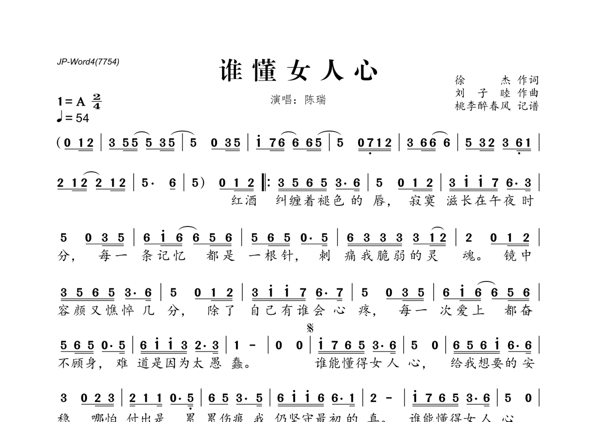 《谁懂女人心》是陈瑞演唱的一首歌曲,拍号为2/4拍,歌曲速度为每分钟54拍,这份简谱共有一张高清图谱,图谱由 @桃李醉春风 编配上传。