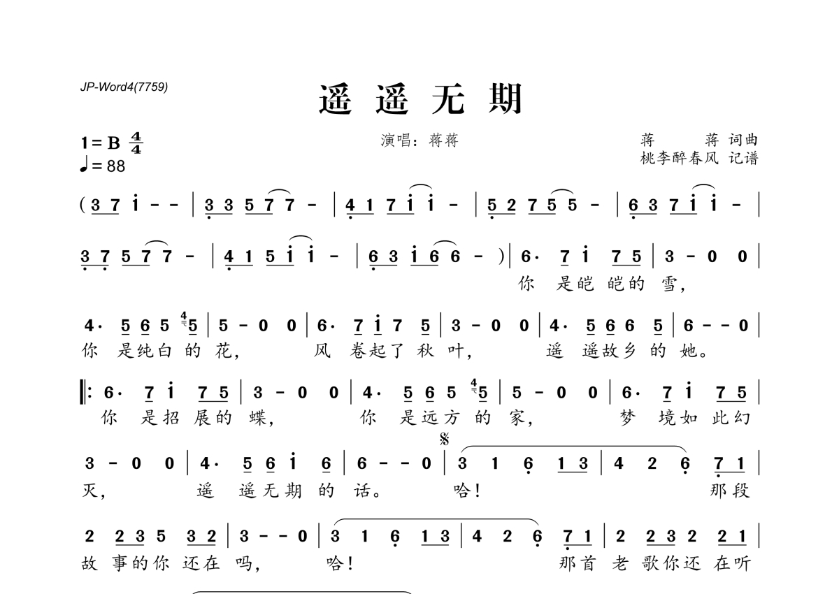《遥遥无期》是蒋蒋演唱的一首歌曲,拍号为4/4拍,歌曲速度为每分钟88拍,这份简谱共有一张高清图谱,图谱由 @桃李醉春风 编配上传。
