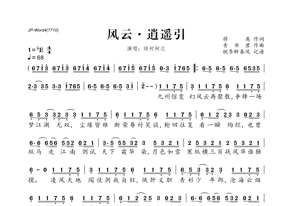 《风云·逍遥引》是绯村柯北演唱的一首歌曲,拍号为4/4拍,歌曲速度为每分钟68拍,这份简谱共有一张高清图谱,图谱由 @桃李醉春风 编配上传。
