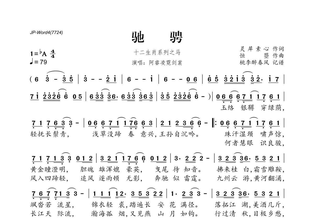 《驰骋》是阿睿凌霓剑裳演唱的一首歌曲,拍号为4/4拍,歌曲速度为每分钟79拍,这份简谱共有一张高清图谱,图谱由 @桃李醉春风 编配上传。