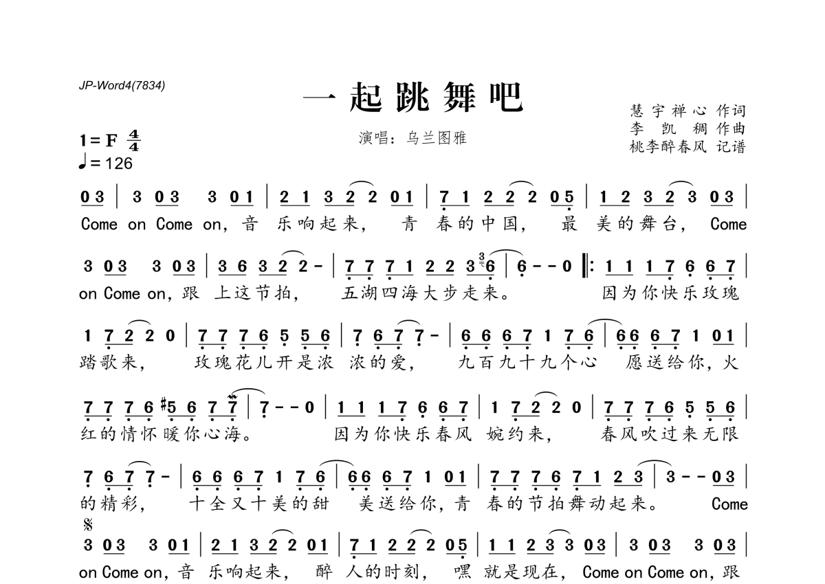 《一起跳舞吧》是乌兰图雅演唱的一首歌曲,拍号为4/4拍,歌曲速度为每分钟126拍,这份简谱共有一张高清图谱,图谱由 @桃李醉春风 编配上传。