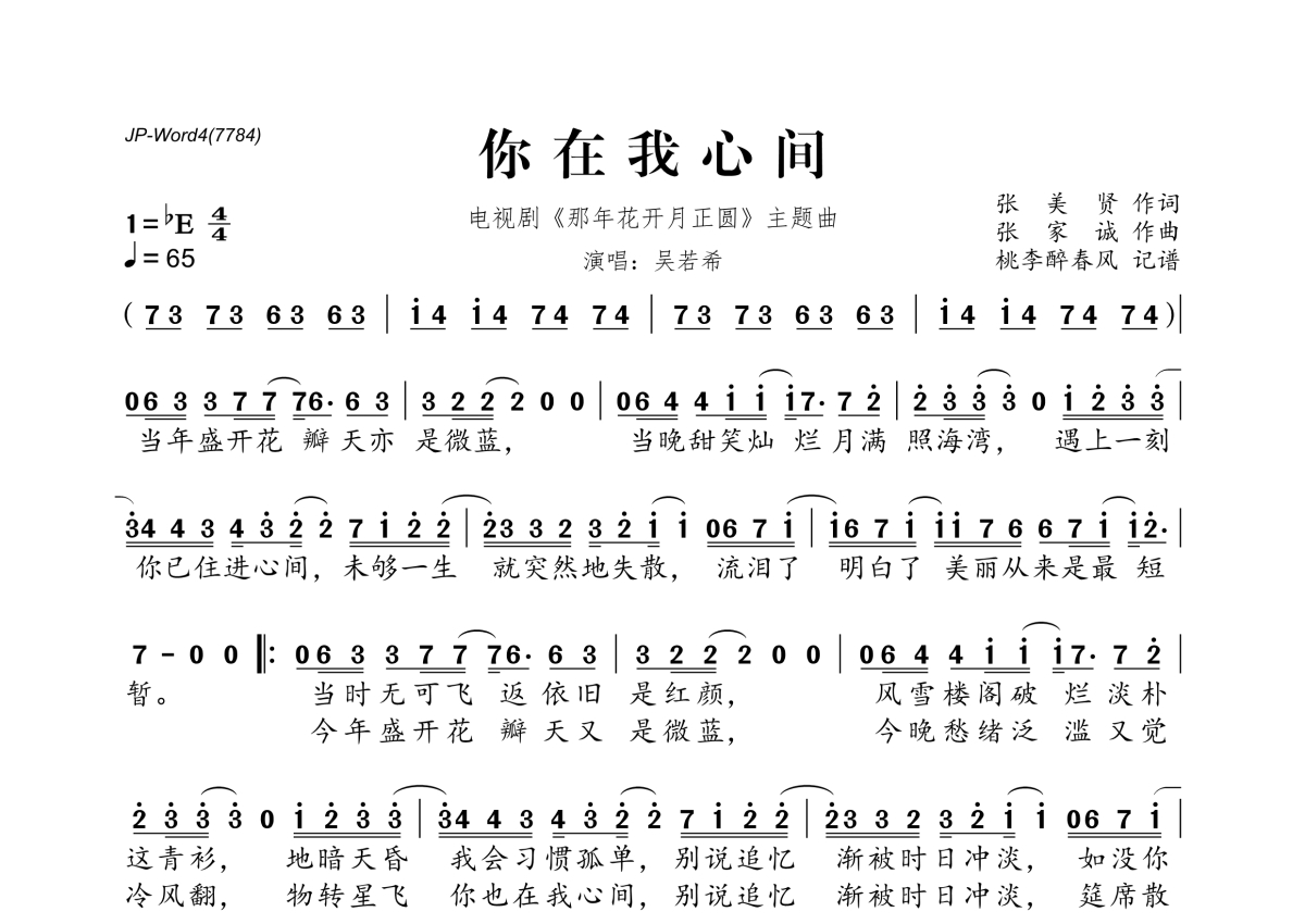 《你在我心间》是吴若希演唱的一首歌曲,拍号为4/4拍,歌曲速度为每分钟65拍,这份简谱共有一张高清图谱,图谱由 @桃李醉春风 编配上传。