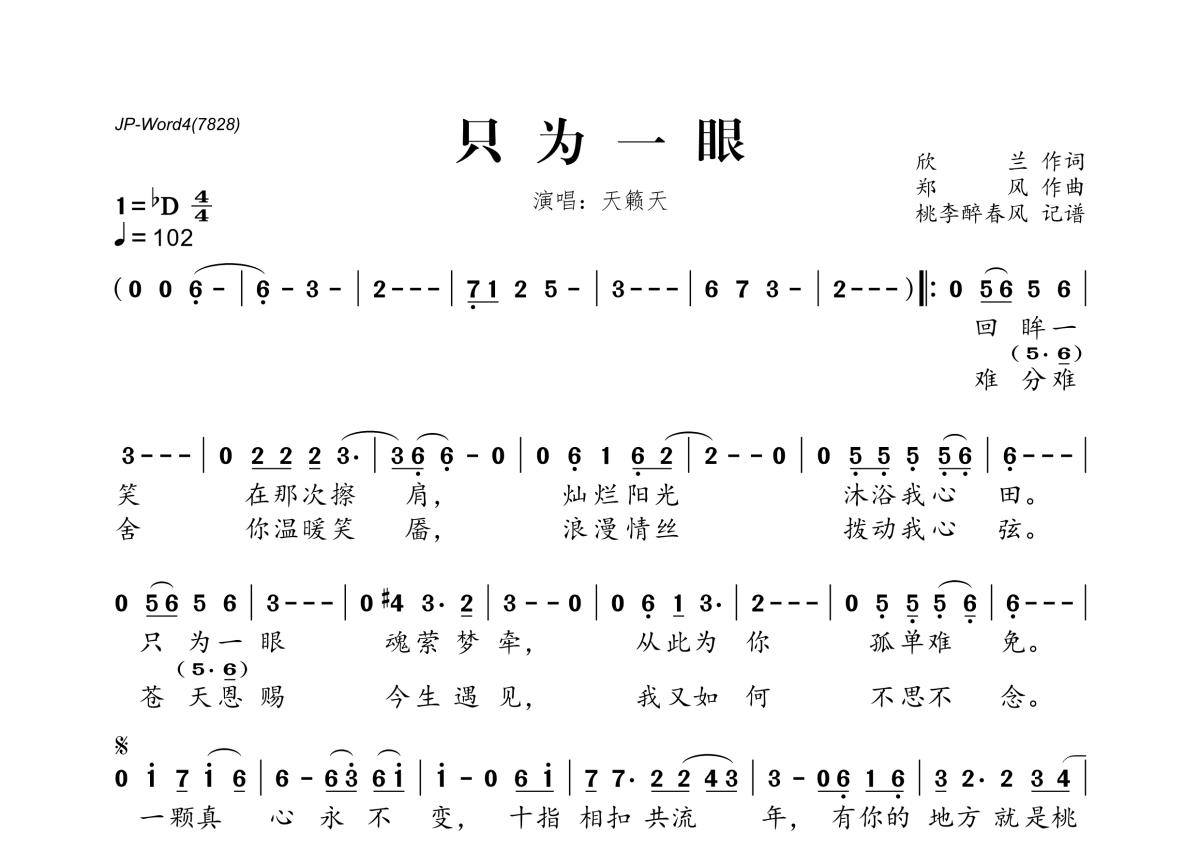 《只为一眼》是天籁天演唱的一首歌曲,拍号为4/4拍,歌曲速度为每分钟102拍,这份简谱共有一张高清图谱,图谱由 @桃李醉春风 编配上传。