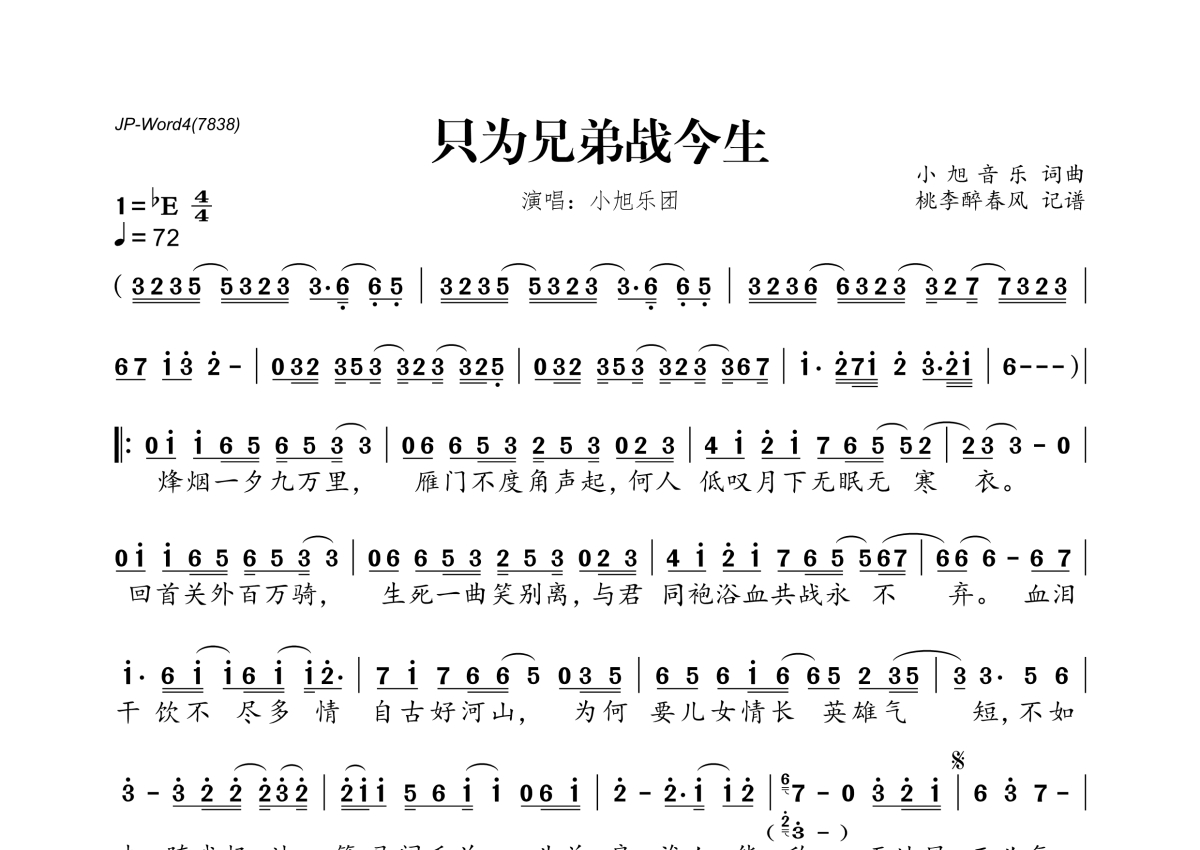 《只为兄弟战今生》是小旭音乐演唱的一首歌曲,拍号为4/4拍,歌曲速度为每分钟72拍,这份简谱共有一张高清图谱,图谱由 @桃李醉春风 编配上传。