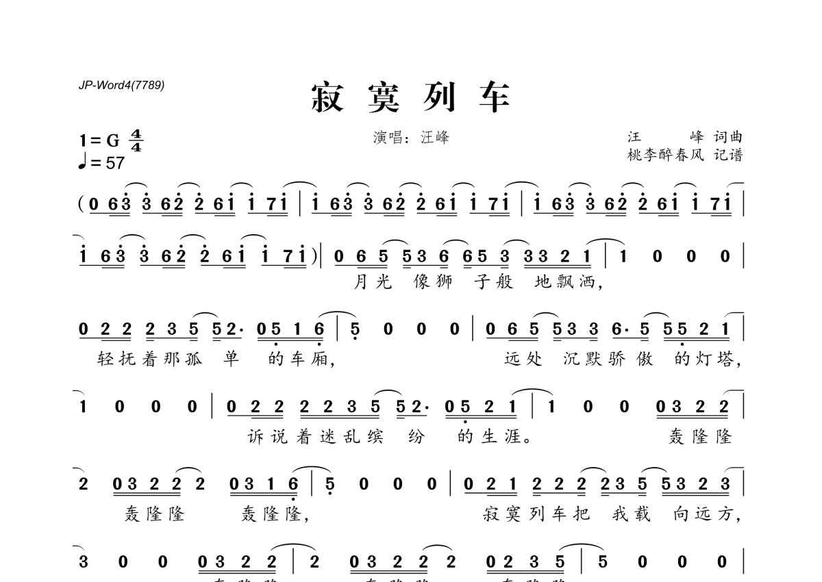 《寂寞列车》是汪峰演唱的一首歌曲,拍号为4/4拍,歌曲速度为每分钟57拍,这份简谱共有两张高清图谱,图谱由 @桃李醉春风 编配上传。