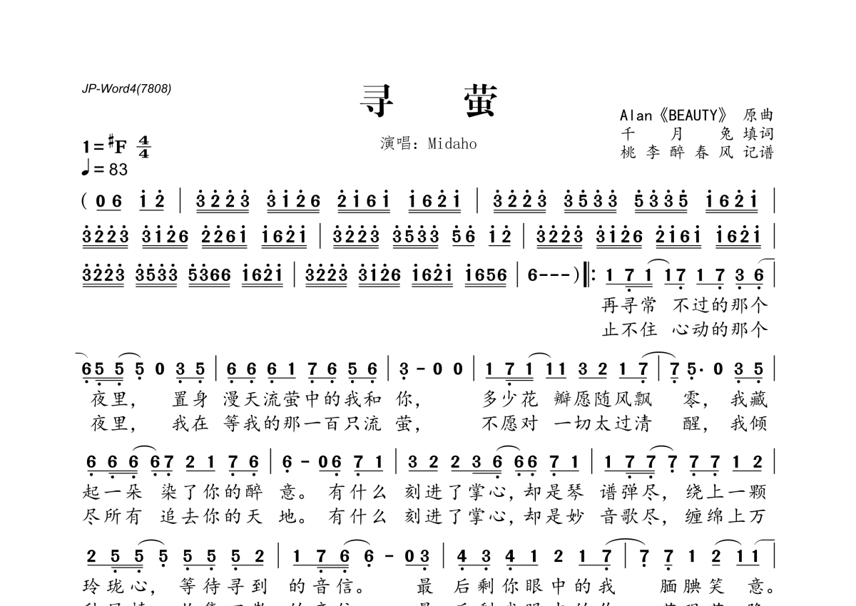《寻萤》是Widaho演唱的一首歌曲,拍号为4/4拍,歌曲速度为每分钟83拍,这份简谱共有一张高清图谱,图谱由 @桃李醉春风 编配上传。
