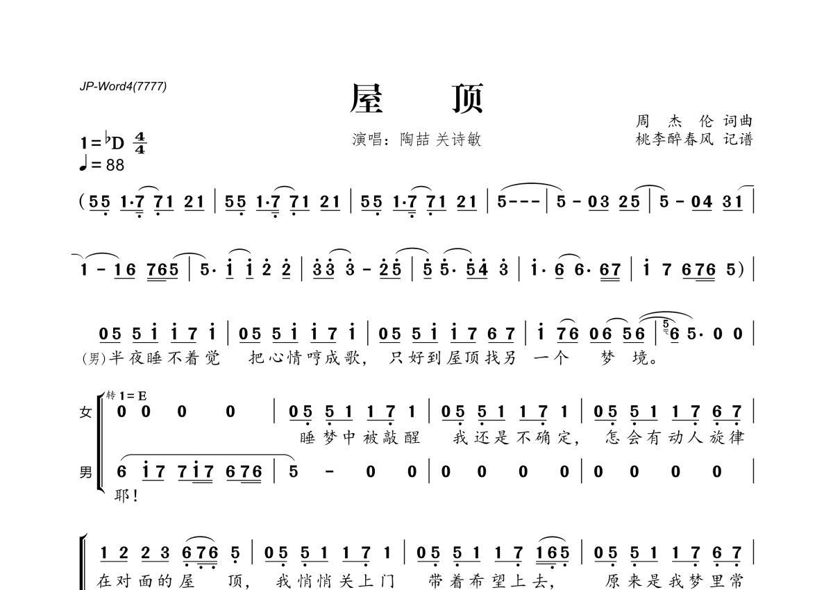 《屋顶》是陶喆、关诗敏演唱的一首歌曲,拍号为4/4拍,歌曲速度为每分钟88拍,这份简谱共有三张高清图谱,图谱由 @桃李醉春风 编配上传。