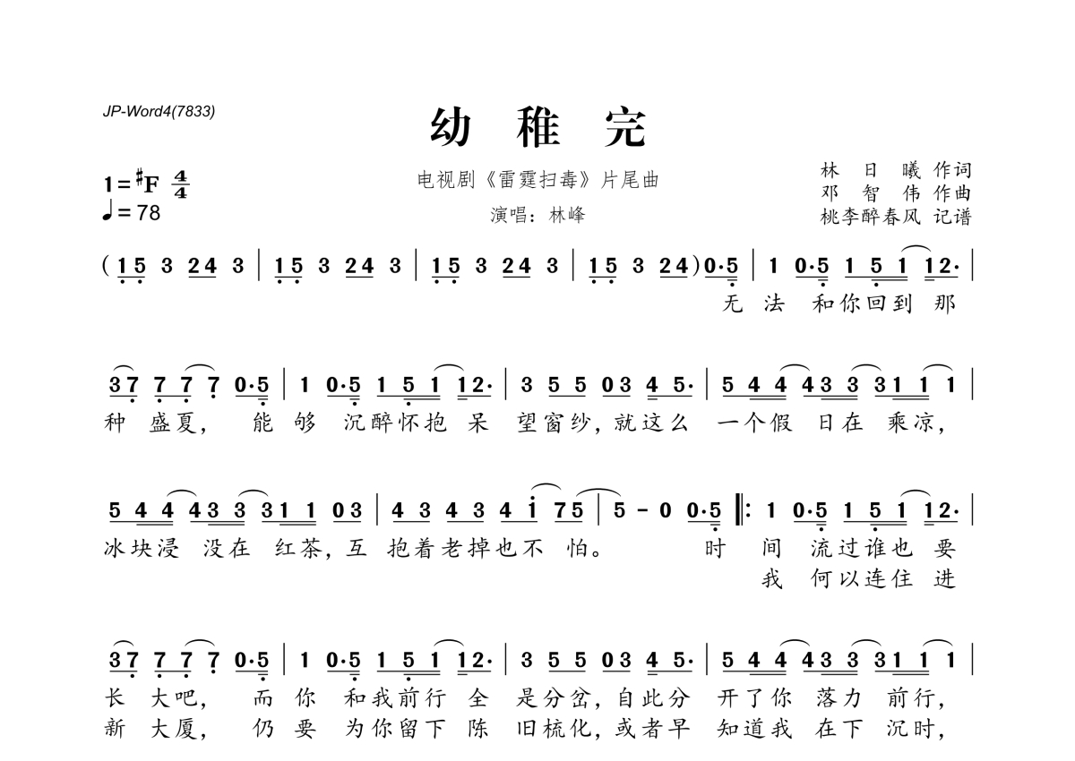 《幼稚完》是林峰演唱的一首歌曲,拍号为4/4拍,歌曲速度为每分钟78拍,这份简谱共有两张高清图谱,图谱由 @桃李醉春风 编配上传。