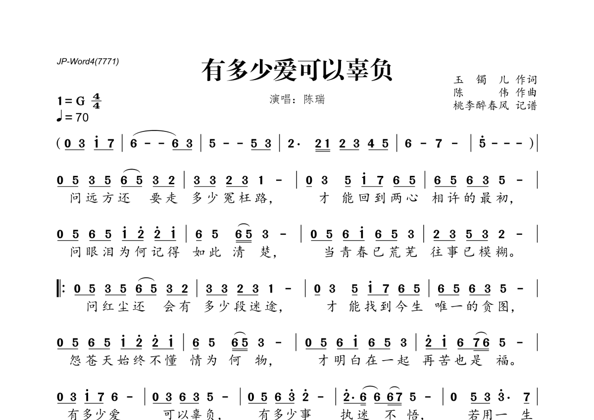 《有多少爱可以辜负》是陈瑞演唱的一首歌曲,拍号为4/4拍,歌曲速度为每分钟70拍,这份简谱共有一张高清图谱,图谱由 @桃李醉春风 编配上传。