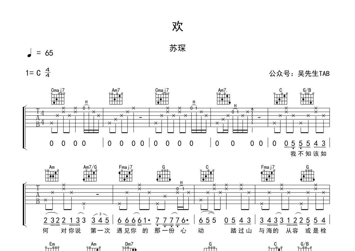 《欢》是苏琛演唱的一首歌曲,本吉他谱采用的是C调指法编配,这份吉他谱共有两张高清图谱,图谱由 @吴先生TAB 编配上传,图谱使用六线谱编配,包含吉他和弦指法、简谱以及歌词部分,使用这份欢吉他谱,可以让你更加方便地掌握这首歌曲的弹唱技巧,快来尝试吧。苏琛《欢》吉他谱_C调吉他弹唱谱。