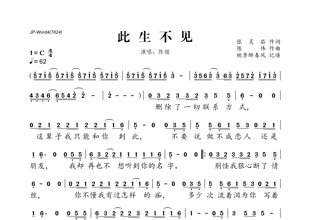 此生不见简谱 - 陈瑞演唱