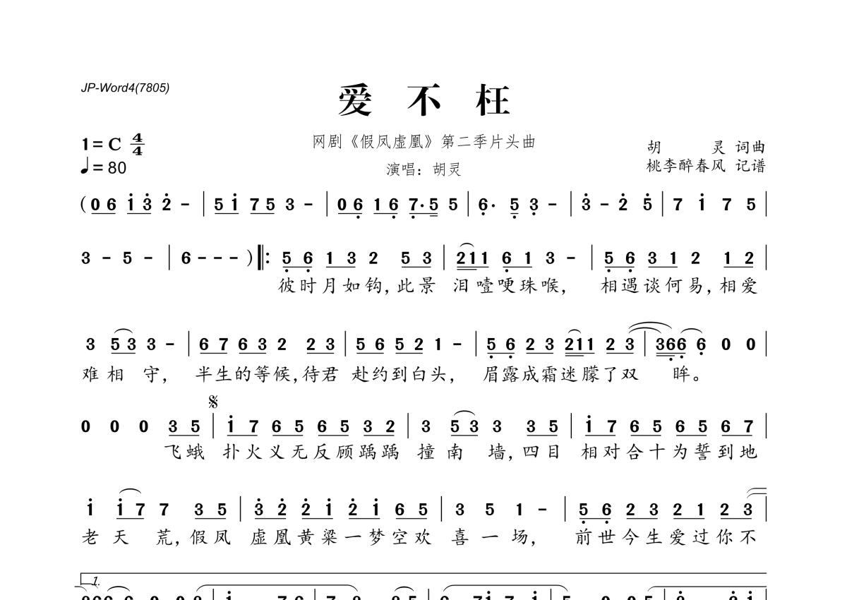 《爱不枉》是胡灵演唱的一首歌曲,拍号为4/4拍,歌曲速度为每分钟80拍,这份简谱共有一张高清图谱,图谱由 @桃李醉春风 编配上传。