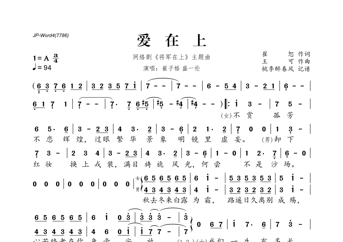 《爱在上》是崔子格&盛一伦演唱的一首歌曲,拍号为3/4拍,歌曲速度为每分钟94拍,这份简谱共有一张高清图谱,图谱由 @桃李醉春风 编配上传。