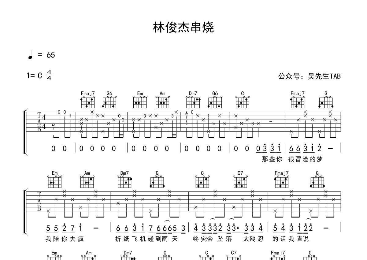 《林俊杰歌曲串烧》是林俊杰演唱的一首歌曲,本吉他谱采用的是C调指法编配,这份吉他谱共有四张高清图谱,图谱由 @吴先生TAB 编配上传,图谱使用六线谱编配,包含吉他和弦指法、简谱以及歌词部分,使用这份林俊杰歌曲串烧吉他谱,可以让你更加方便地掌握这首歌曲的弹唱技巧,快来尝试吧。谱子里包含的歌曲有:1.那些很冒险的梦2.修炼爱情3.心墙4.AlwaysOnline5.交换余生6.关键词7.醉赤壁8.她说大多数都是大家耳熟能详的歌曲。其实《背对背拥抱》《妈妈的娜鲁娃》《第几个一百天》《爱笑的眼睛》《发现爱》《期待爱》《手心的蔷薇》这几首歌也是4536251的走向,但是想到这几首歌可能大家没有那么熟悉,所以并没有加进去(其实我就是懒)。因为这些歌都不是同一个调,所以改编成一个调后,需要根据自己的嗓子音高来夹变调夹,试听做的是夹2品。个人建议男生可以夹0-2品,女生2-5品。关于节奏可以根据自己的喜好来变化,不一定完全按照此谱。