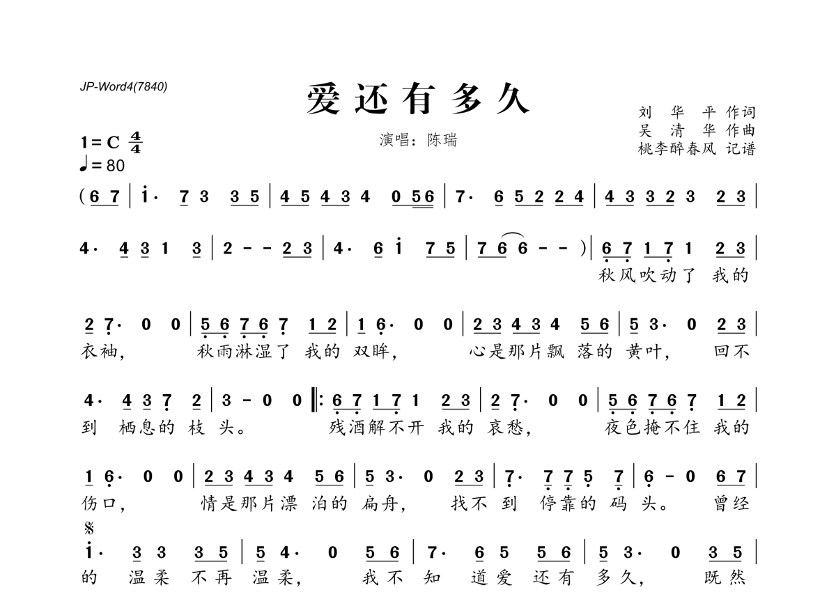 《爱还有多久》是陈瑞演唱的一首歌曲,拍号为4/4拍,歌曲速度为每分钟80拍,这份简谱共有一张高清图谱,图谱由 @桃李醉春风 编配上传。
