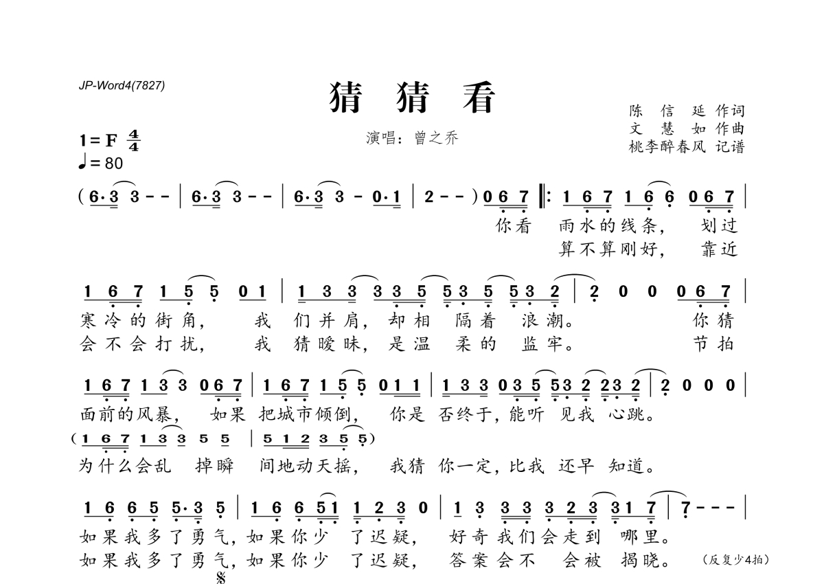《猜猜看》是曾之乔演唱的一首歌曲,拍号为4/4拍,歌曲速度为每分钟80拍,这份简谱共有一张高清图谱,图谱由 @桃李醉春风 编配上传。