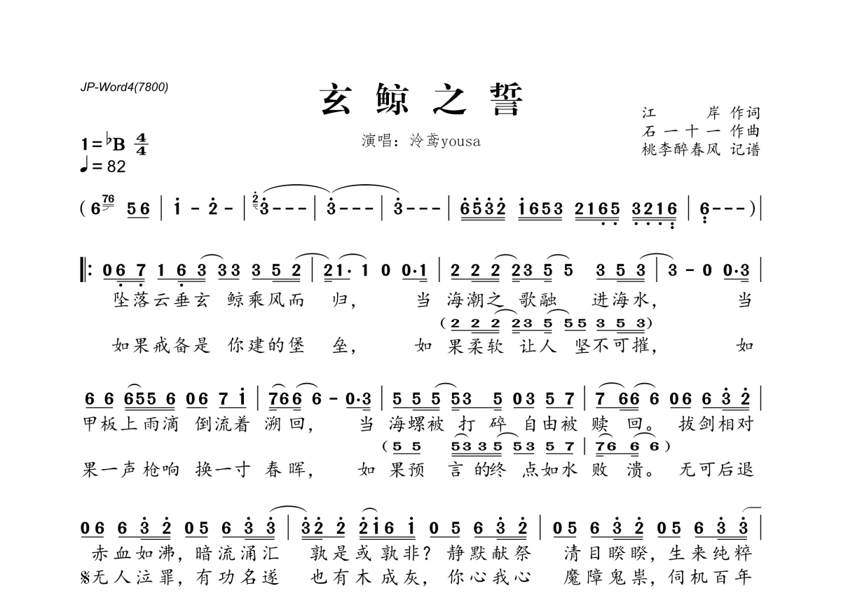 《玄鲸之誓》是泠鸢yousa演唱的一首歌曲,拍号为4/4拍,歌曲速度为每分钟82拍,这份简谱共有一张高清图谱,图谱由 @桃李醉春风 编配上传。