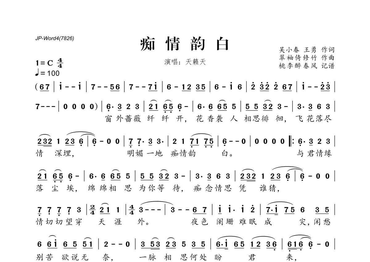 《痴情韵白》是天籁天演唱的一首歌曲,拍号为4/4拍,歌曲速度为每分钟100拍,这份简谱共有一张高清图谱,图谱由 @桃李醉春风 编配上传。