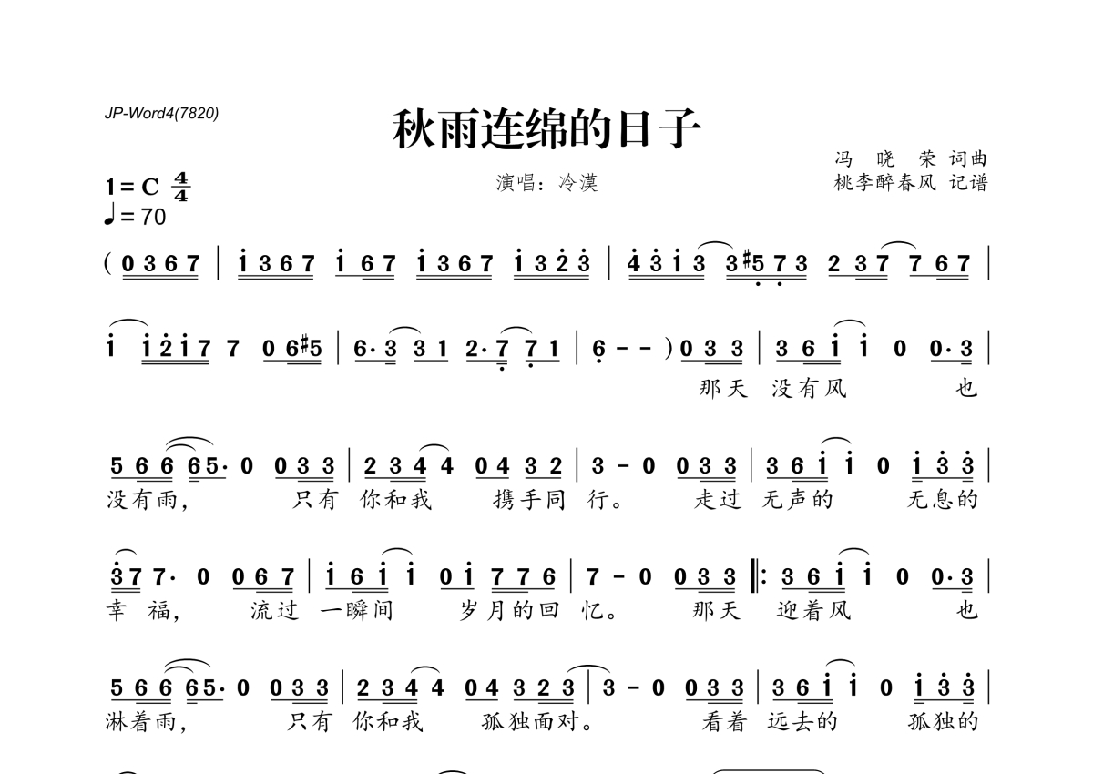 《秋雨连绵的日子》是冷漠演唱的一首歌曲,拍号为4/4拍,歌曲速度为每分钟70拍,这份简谱共有一张高清图谱,图谱由 @桃李醉春风 编配上传。