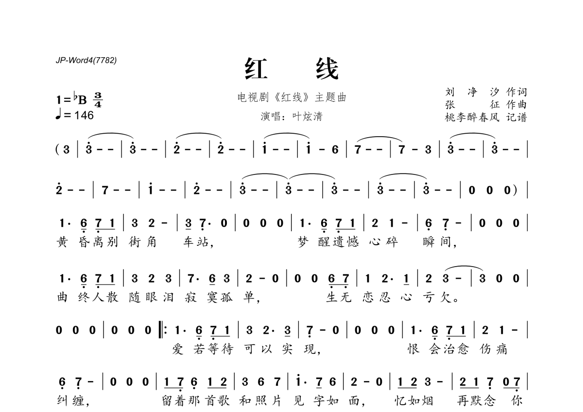《红线》是叶炫清演唱的一首歌曲,拍号为3/4拍,歌曲速度为每分钟146拍,这份简谱共有一张高清图谱,图谱由 @桃李醉春风 编配上传。