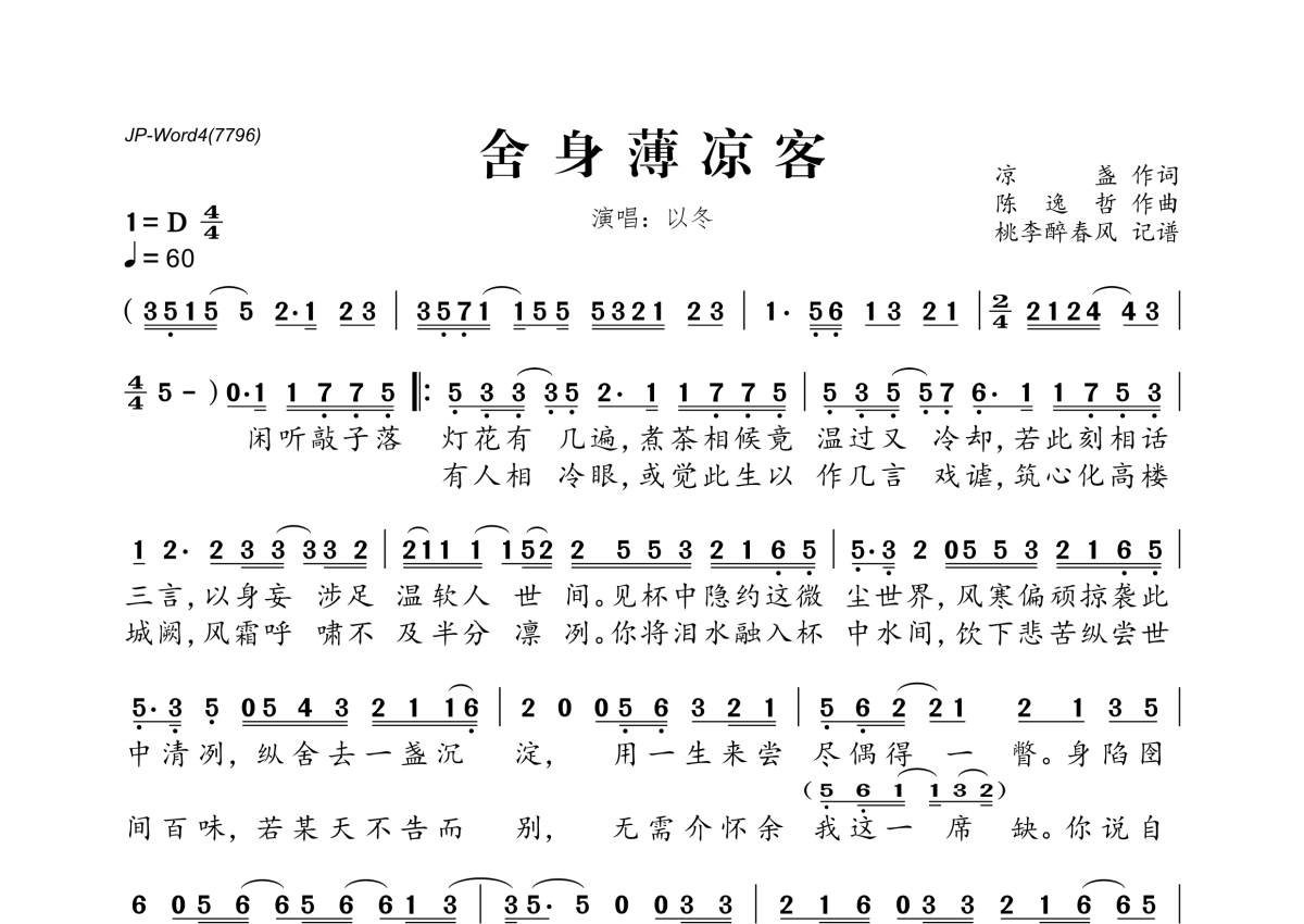 《舍身薄凉客》是以冬演唱的一首歌曲,拍号为4/4拍,歌曲速度为每分钟60拍,这份简谱共有一张高清图谱,图谱由 @桃李醉春风 编配上传。
