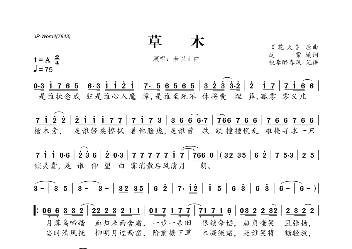 《草木》是若以止白演唱的一首歌曲,拍号为2/4拍,歌曲速度为每分钟75拍,这份简谱共有两张高清图谱,图谱由 @桃李醉春风 编配上传。