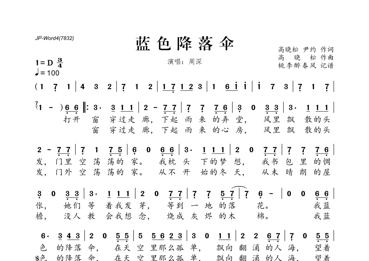《蓝色降落伞》是周深演唱的一首歌曲,拍号为3/4拍,歌曲速度为每分钟100拍,这份简谱共有一张高清图谱,图谱由 @桃李醉春风 编配上传。