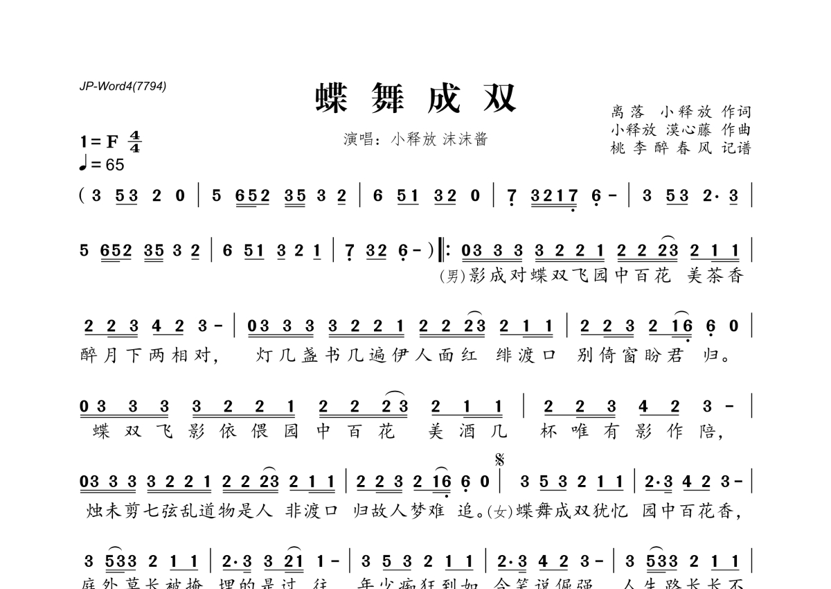 《蝶舞成双》是小释放&沫沫酱演唱的一首歌曲,拍号为4/4拍,歌曲速度为每分钟65拍,这份简谱共有一张高清图谱,图谱由 @桃李醉春风 编配上传。