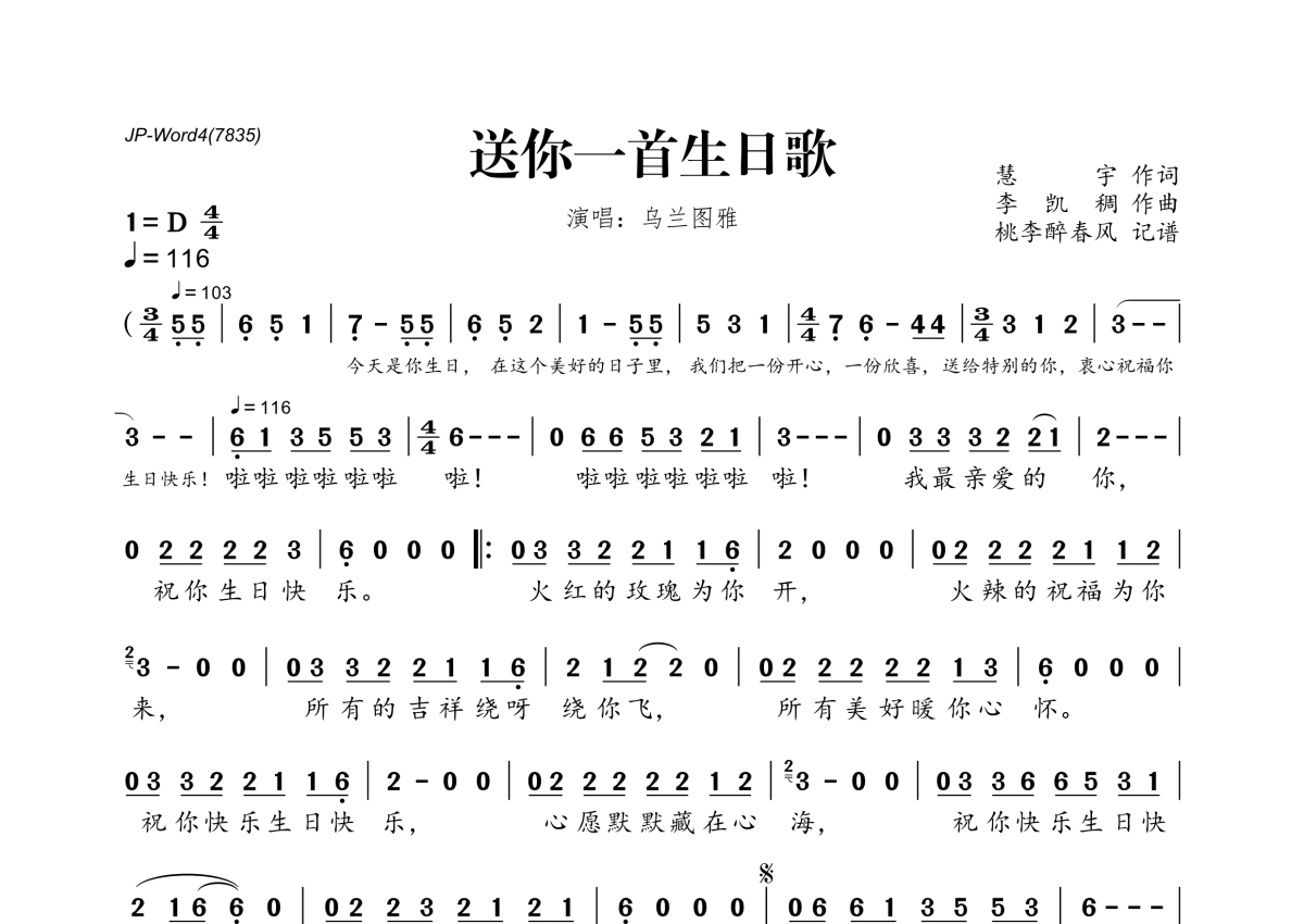 《送你一首生日歌》是乌兰图雅演唱的一首歌曲,拍号为4/4拍,歌曲速度为每分钟116拍,这份简谱共有一张高清图谱,图谱由 @桃李醉春风 编配上传。
