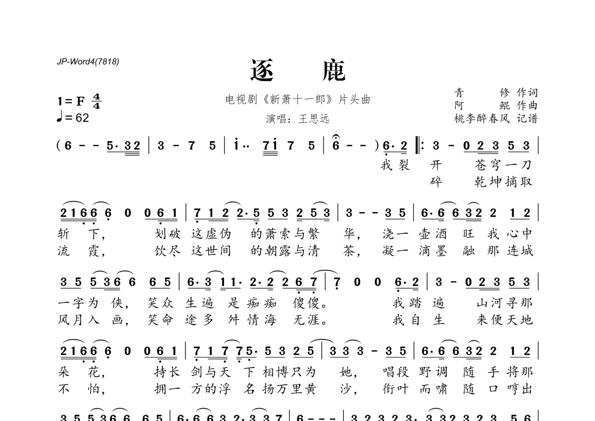 《逐鹿》是王思远演唱的一首歌曲,拍号为4/4拍,歌曲速度为每分钟62拍,这份简谱共有一张高清图谱,图谱由 @桃李醉春风 编配上传。