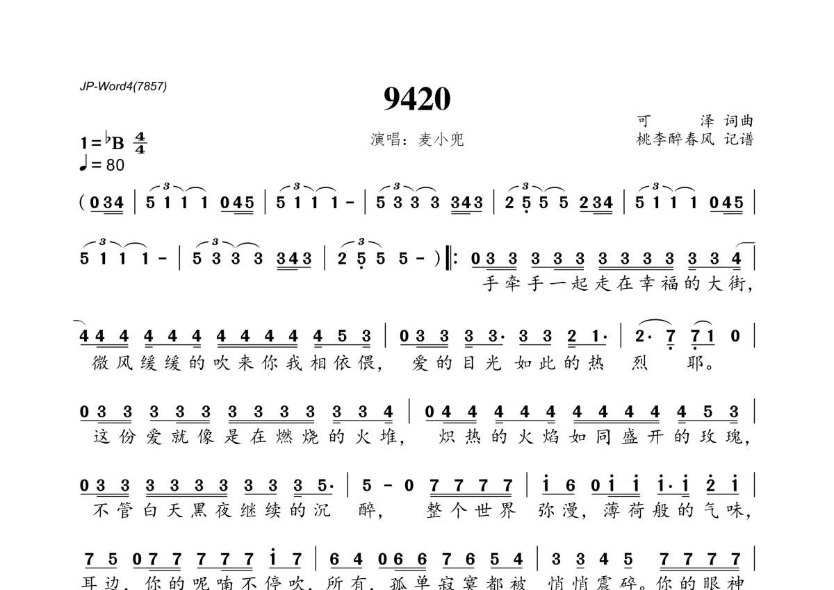 《9420》是麦小兜演唱的一首歌曲,拍号为4/4拍,歌曲速度为每分钟80拍,这份简谱共有一张高清图谱,图谱由 @桃李醉春风 编配上传。