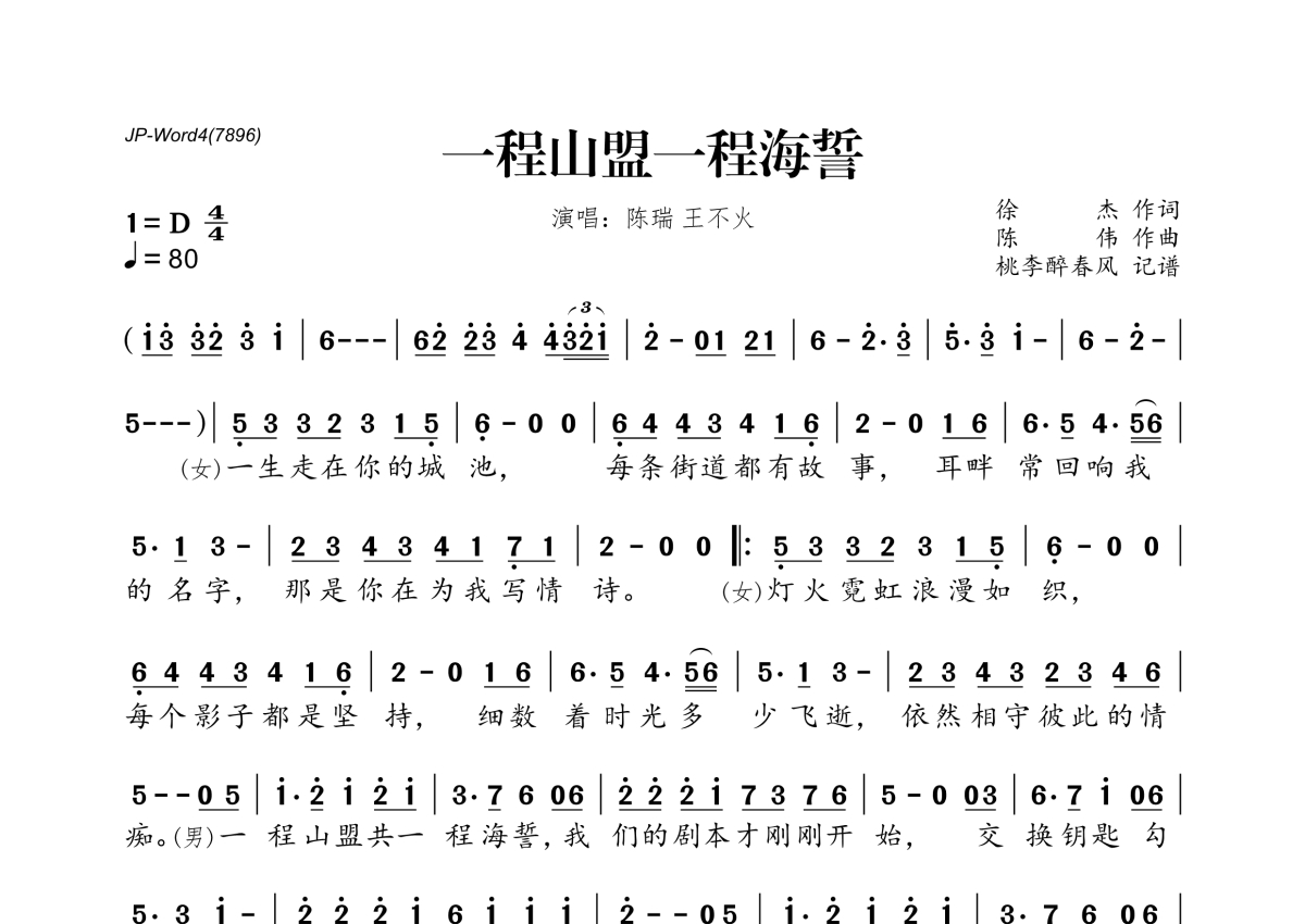 《一程山盟一程海誓》是陈瑞&王不火演唱的一首歌曲,拍号为4/4拍,歌曲速度为每分钟80拍,这份简谱共有一张高清图谱,图谱由 @桃李醉春风 编配上传。