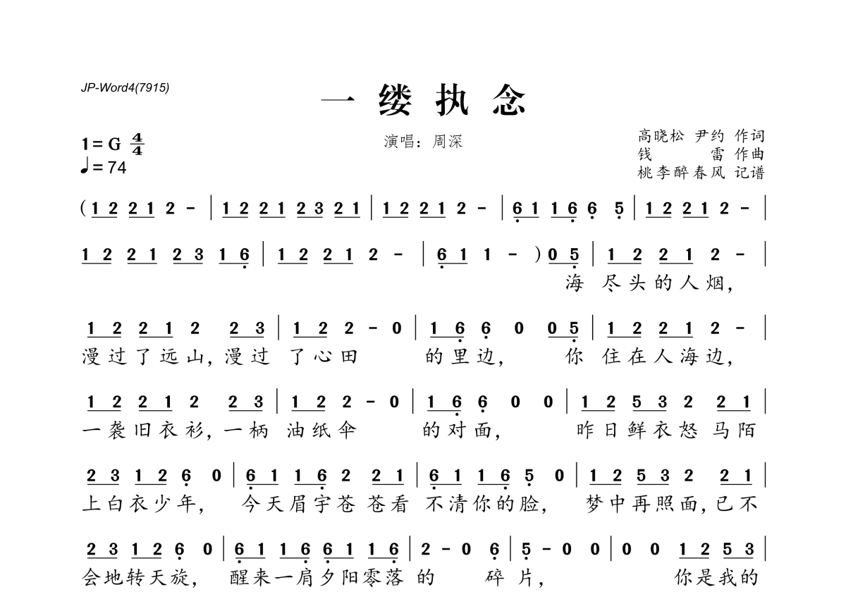 《一缕执念》是周深演唱的一首歌曲,拍号为4/4拍,歌曲速度为每分钟74拍,这份简谱共有一张高清图谱,图谱由 @桃李醉春风 编配上传。