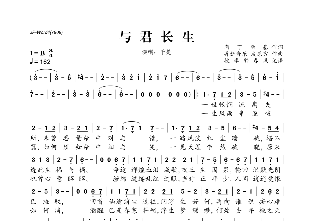 《与君长生》是千是演唱的一首歌曲,拍号为3/4拍,歌曲速度为每分钟162拍,这份简谱共有一张高清图谱,图谱由 @桃李醉春风 编配上传。