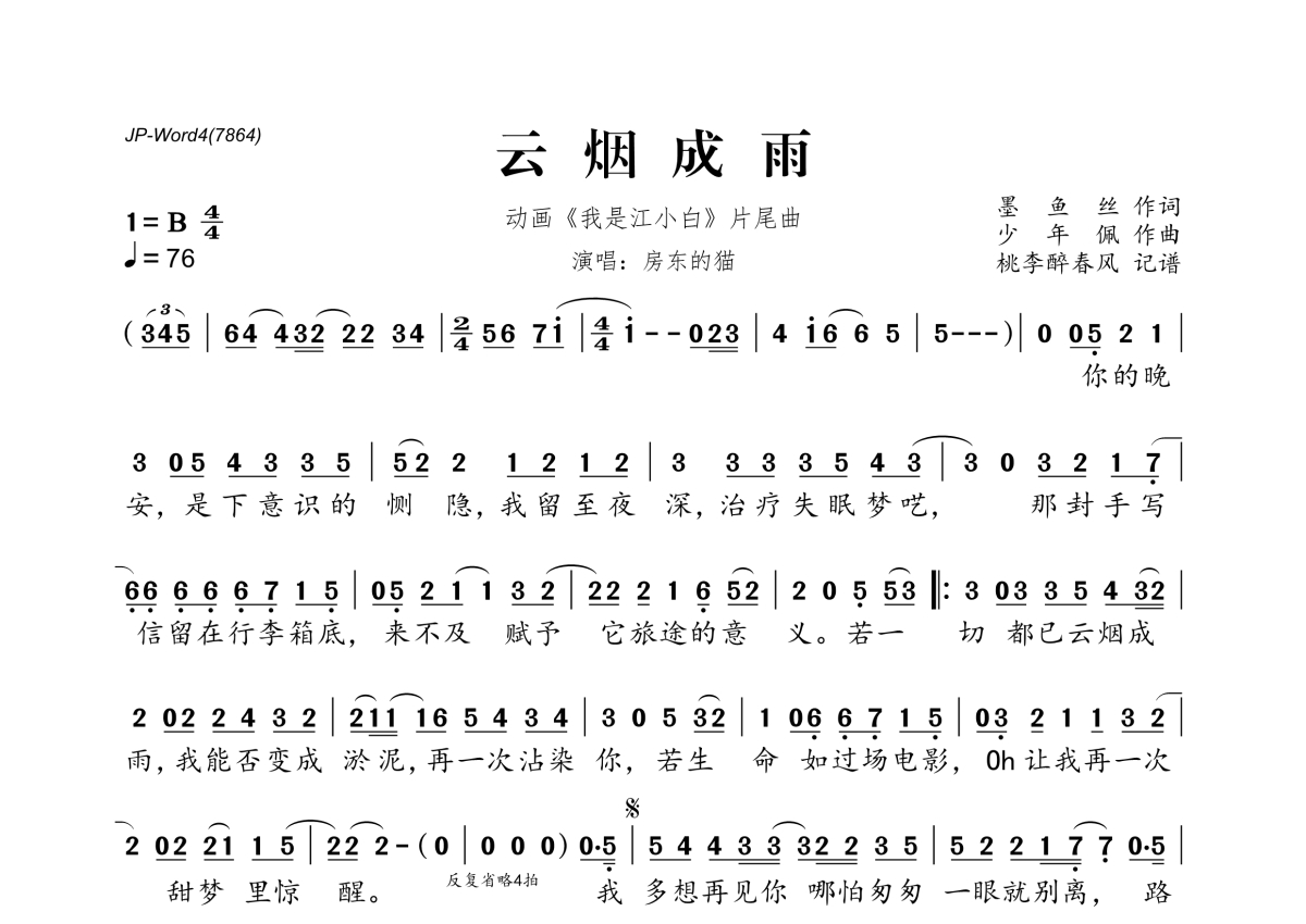 《云烟成雨》是房东的猫演唱的一首歌曲,拍号为4/4拍,歌曲速度为每分钟76拍,这份简谱共有一张高清图谱,图谱由 @桃李醉春风 编配上传。